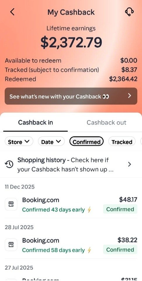 For example, if booking.com are offering 15% back. You open the Shopback app 1st, find booking.com and select it. It will link to and open your actual Booking.com app. If you go on to book a room, your purchase will be tracked by Shopback. After your trip (often a pay on stay) you will get 15% back, withdrawable to your bank.