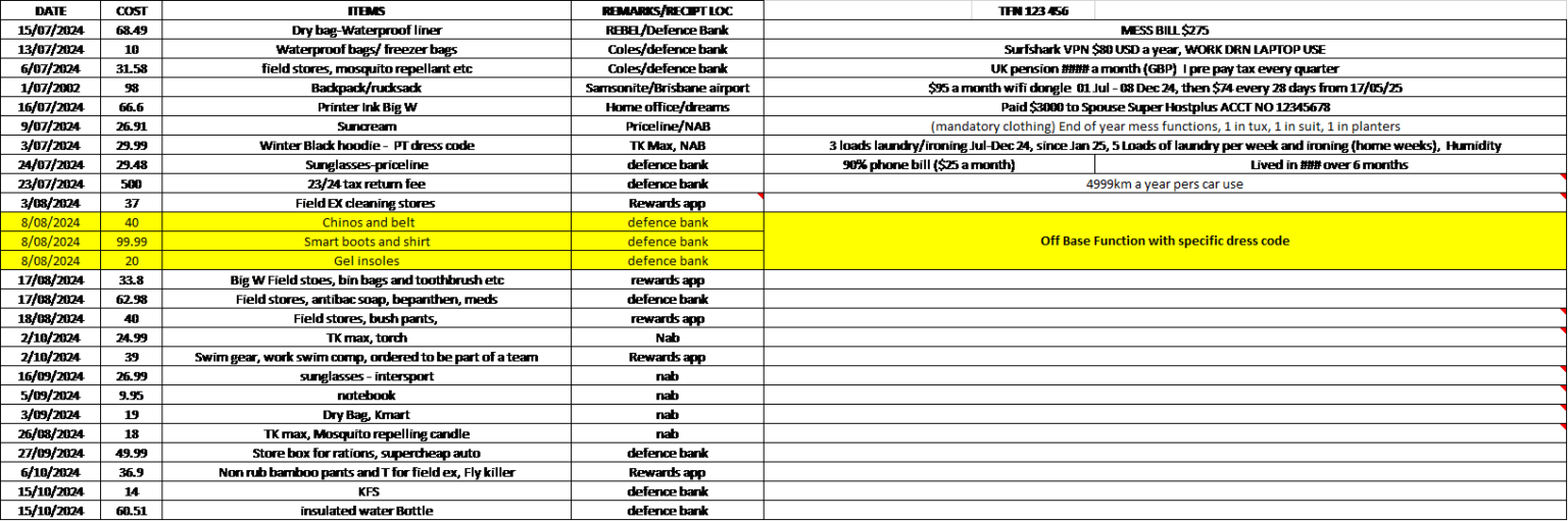 Online tax claim research will get you so far but clever wording and using an ADF specialist tax agent will get you further. If you or your dependants buy something for ‘your work’ with your individual bank account, joint bank account or you have the receipt, claim it.